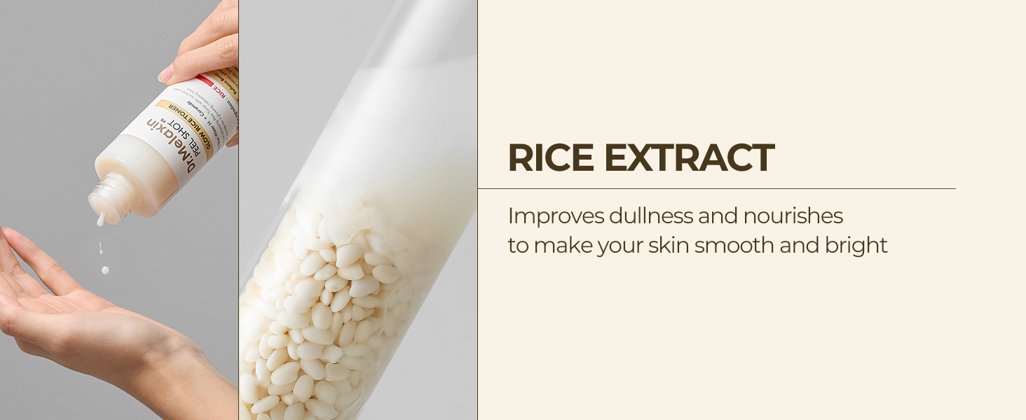 Discover the power of rice-based skincare with Dr. Melaxin PeelShot Rice Toner. Infused with Rice Bran Water, which contains over 90% of rice's nutrients, and enhanced with vitamin- and mineral-rich Rice Amino Acids, this toner brightens dull skin, replenishes vital nutrients, and creates smooth, radiant skin. The dense high-molecular Ceramide also works to lock in moisture, leaving your skin feeling hydrated and balanced. This toner offers a new type of skincare that transforms your skin with the natural benefits of rice fermentation.